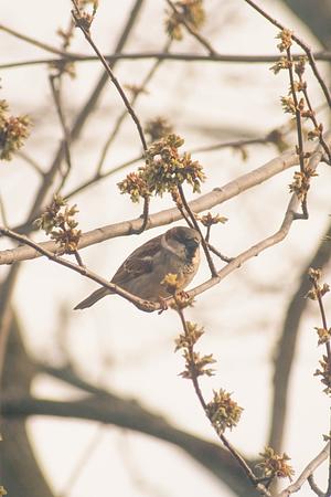 A photo of a bird sitting on a branch in spring.